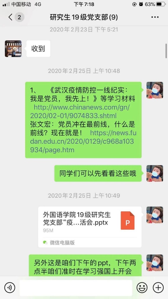 澳门永利yl6776研究生各党支部,充分运用网络新媒体阵地,创新组织生活“线上”模式,在特殊时期在线上开展各研究生党支部党员大会,通过“云端”开展理论学习、党员与群众联系工作,在论文进度、求职签约、毕业答辩、日常打卡等方面开展定点沟通帮扶,充分发挥党支部战斗堡垒作用和党员先锋模范作用。下面就让我们一起去了解他们在疫情期间的行动吧。