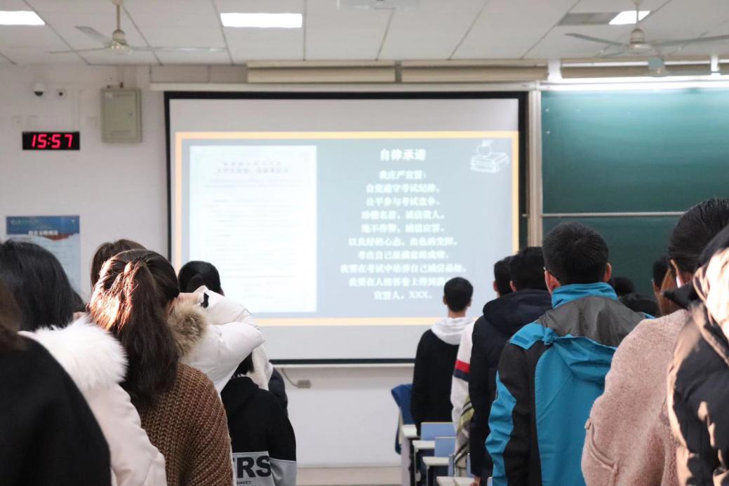 会议最后,盛嘉贤针对即将到来的考试月进行了考风考纪诚信教育,强调了考试纪律的严肃性及考试违规的严重性,要求同学们认真复习,在考试中严守考场纪律,杜绝不良行为。全体同学进行了自律承诺和集体宣誓,承诺:“自觉遵守考试纪律,公平参与考试竞争。以良好的心态,出色的发挥,考出自己最满意的成绩。在考试中培养自己诚信品格,在人格答卷上得到满分。”