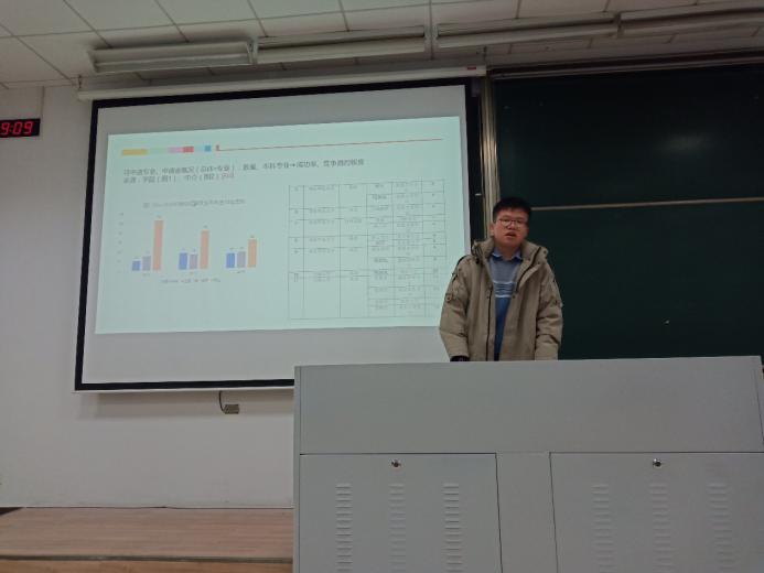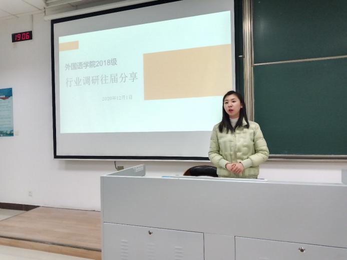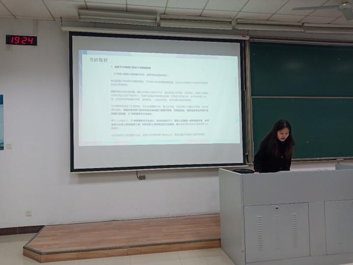 接着,杨雨柔同学就考研方向的行业调研进行了分享,以澳门永利yl6776大学英语专业为例,具体讲解了行业调研时要注意考研形势、参考书目的选读、考研准备时间、复习备考策略等事项。