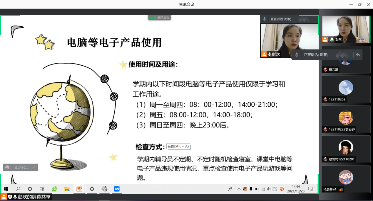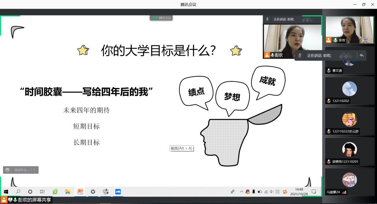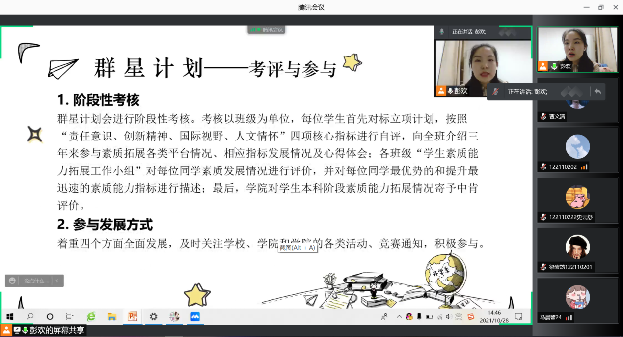 为了增进大一新生对校院制度及“群星计划”学生素质拓展平台的了解,更好地帮助新生们适应大学生活, 10月28日下午,澳门永利yl6776在线上腾讯会议平台召开了2021级本科新生“群星计划”主题年级会。2021级本科生辅导员彭欢、兼职辅导员曹文清,2021级全体新生参加会议,会议由彭欢主持。