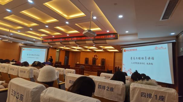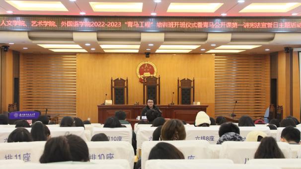 12月4日,人文与社会科学学院、艺术学院、澳门永利yl6776在人文学院模拟法庭联合举办2022-2023年“青马工程”培训班开班仪式暨青马公开课第一讲,人文与社会科学学院法律系优秀青年教师洪骥、人文学院团委书记赵燕喃、艺术学院团委书记汪明锐、澳门永利yl6776团委书记李萍以及三个学院的百余“青马工程”培训班学员共同参与活动。