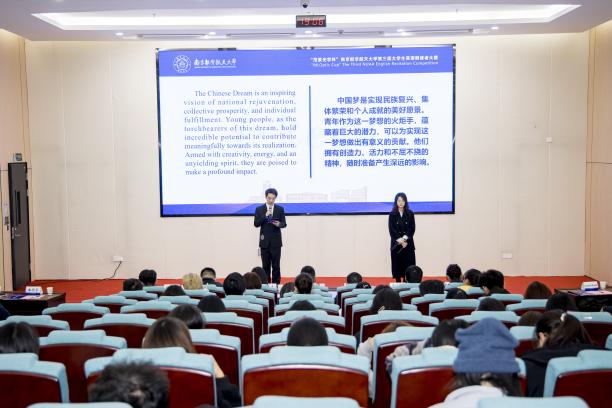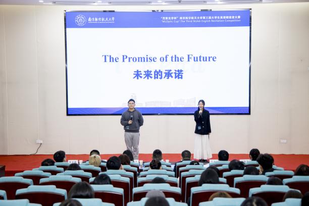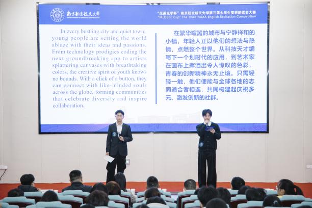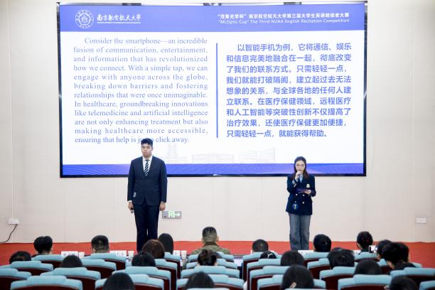 决赛现场高潮迭起。首轮朗诵,十二强选手声情并茂,演绎经典名篇;随之而来的“百秒图说南航”环节,晋级的六强选手更是以自信的风采,围绕一幅幅珍贵的南航影像,用英语娓娓道来其背后的故事与精神。他们的讲述不仅引发了全场师生的深切共鸣,更在热烈的掌声中,将南航人的集体记忆与自豪感凝聚于一刻。