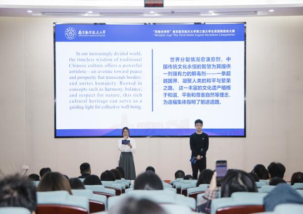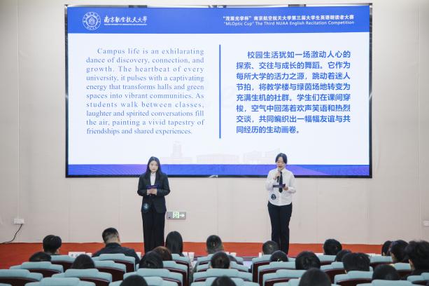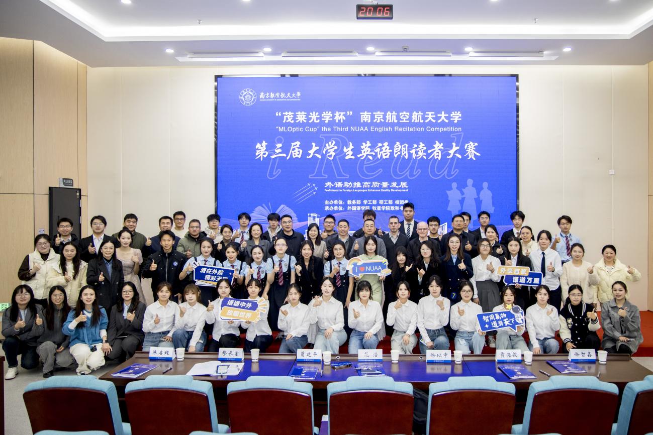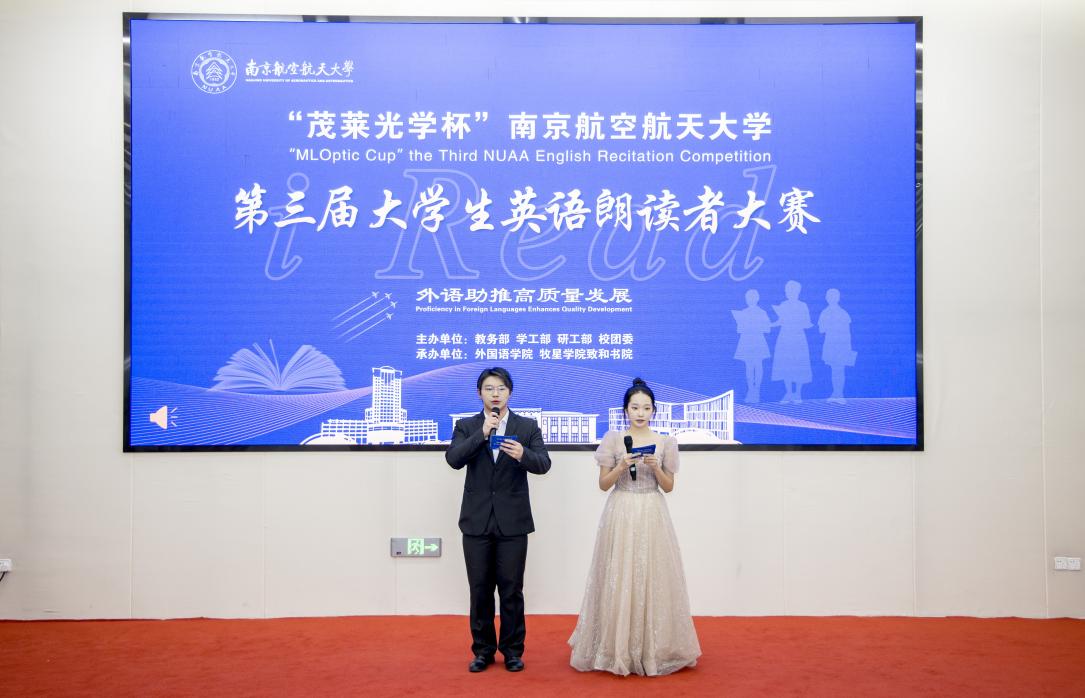 为提高永利官网学生英语口语表达能力和朗读技巧,提升学生人文素养,拓宽学生国际视野,鼓励学生讲好鲜活中国故事、展示美好中国形象,培育具备深厚中国情怀、广阔国际视野和卓越跨文化沟通能力的时代人才,11月27日,“茂莱光学杯”澳门永利yl6776第三届大学生英语“朗读者”大赛决赛在南航天目湖校区牧星楼报告厅T2110顺利举行。本次大赛由永利官网教务部、学工部、研工部和校团委主办,澳门永利yl6776和牧星学院致和书院联合承办。茂莱光学科技股份有限公司董事长范浩,北京航空航天大学出版社副总经理、副总编辑葛建平,茂莱光学科技股份有限公司人力资源经理段宇,北京航空航天大学出版社科技出版分社副社长董宜斌,澳门永利yl6776天目湖校区党委书记、管委会主任缪长宗,牧星学院党委书记贡海俊,校宣传部部长助理陈启超,校国际合作处副处长徐智鑫,天目湖校区管委会副主任潘顺荣、于晓、寇晓洁,牧星学院副院长兼党委学生工作部副部长、学生工作处副处长张建辉,牧星学院党委副书记、致和书院执行院长王宇宁,南非艾维国际飞行学院资深教员、通用航空与飞行学院外籍教员Albertus Greeff,澳门永利yl6776大学外语教学部教师Graham Minett,学院院长徐以中,学院党委副书记吴科颖等出席决赛并担任嘉宾评委。