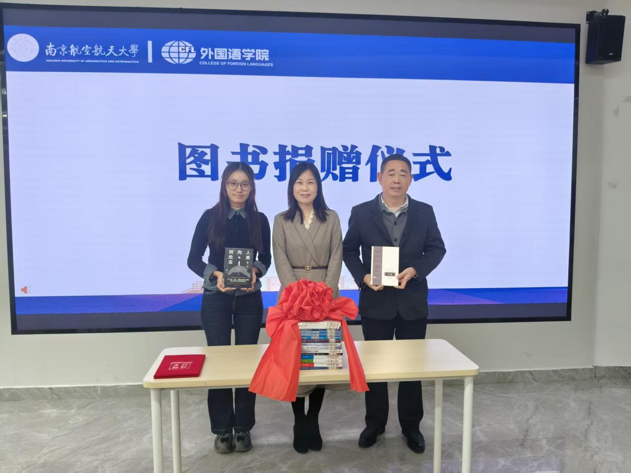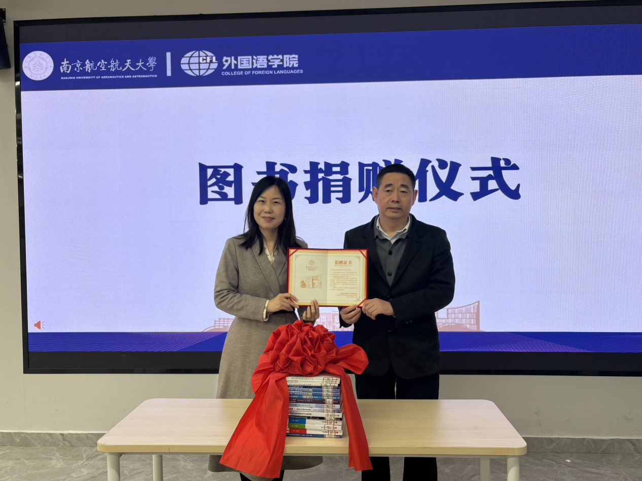 接下来,徐以中与学生代表陆欣妍共同接受了北京航空航天大学出版社图书捐赠。随后,徐以中向北京航空航天大学出版社颁发图书捐赠证书。这批宝贵的文献将作为共享资源,为航空航天、工程技术及人文社科等多领域的学子提供丰厚的学术滋养,助力学生拓展国际视野,攀登科学高峰。