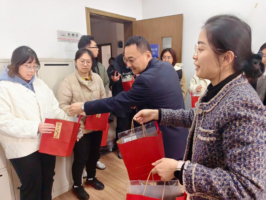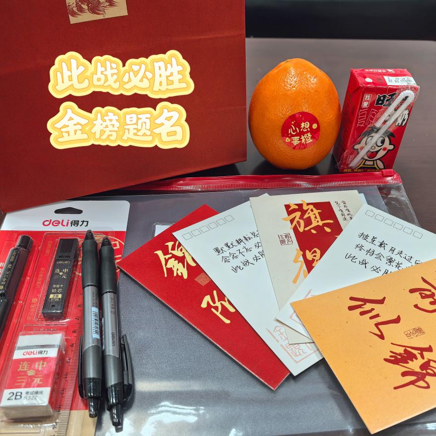 庄群华、吴科颖、周蕾为考研学子送上“考研加油包”。加油包包含寓意“笔下生辉”的文具套装、“心想事成”的橙子、“逢考必‘旺’”的旺仔牛奶以及写满祝愿同学们“‘研’梦必圆”的祝福明信片,同学们收到暖心礼物后十分开心和感动,纷纷表示一定会抓住最后的复习时间,全力以赴,以饱满的精神状态迎接即将到来的考试。